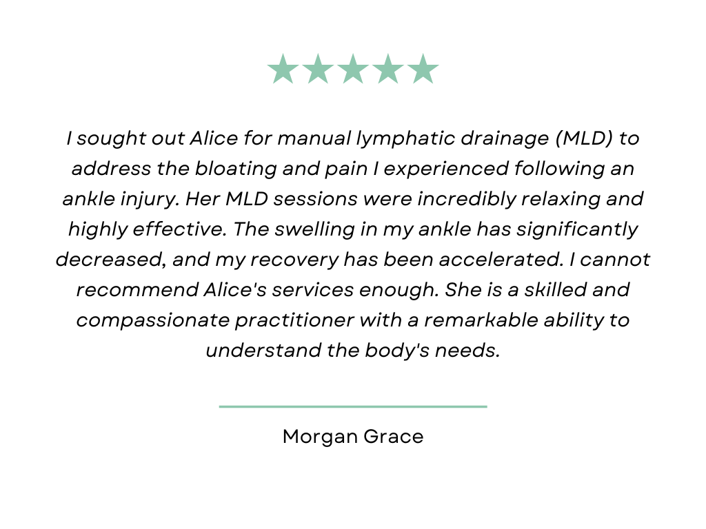 Manual lymphatic drainage stimulates the lymphatic system, aiding in the removal of waste products from the body. It’s a gentle technique that is very efficient to help reduce bloating and speed up recovery from injuries or surgery.